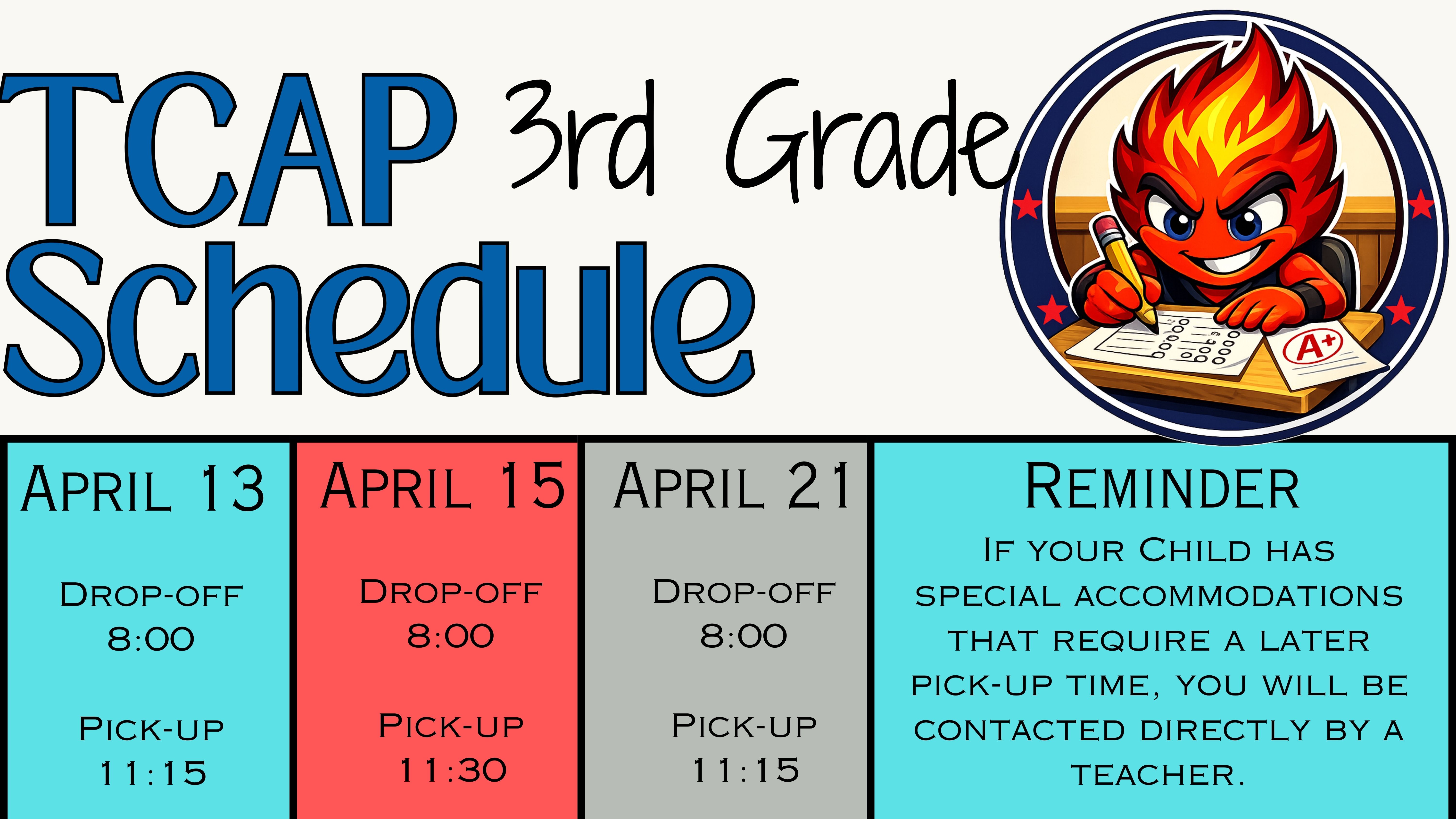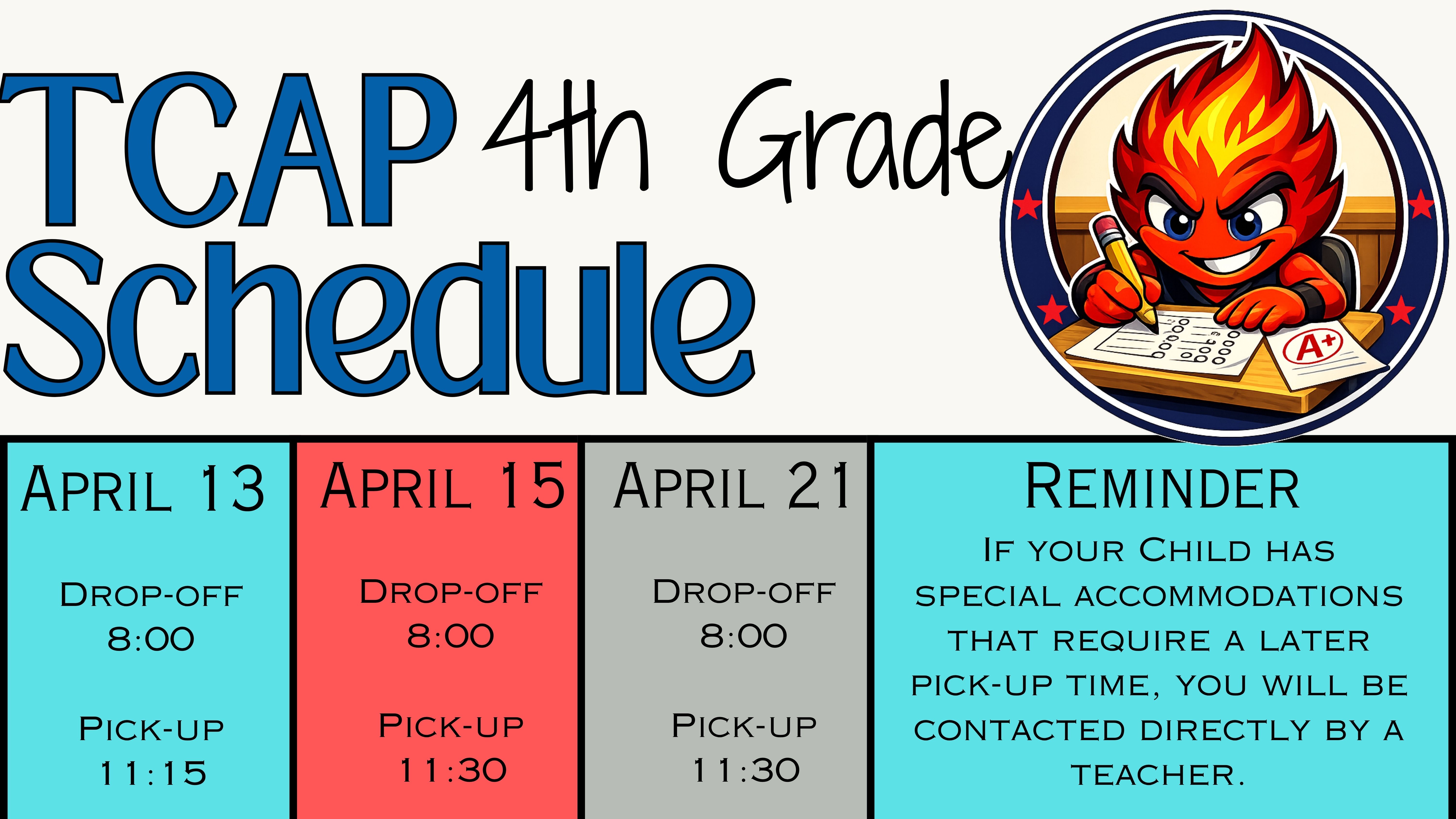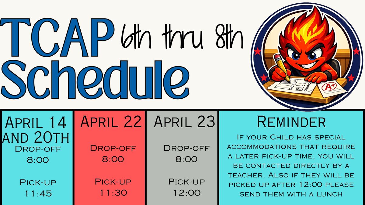 Testing will begin on April 13th. Below you will find a list of grade levels and testing times. All testing dates are required.