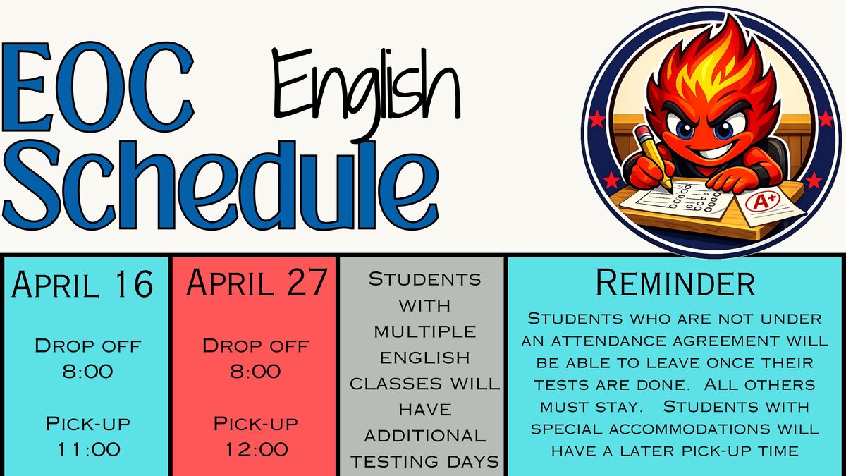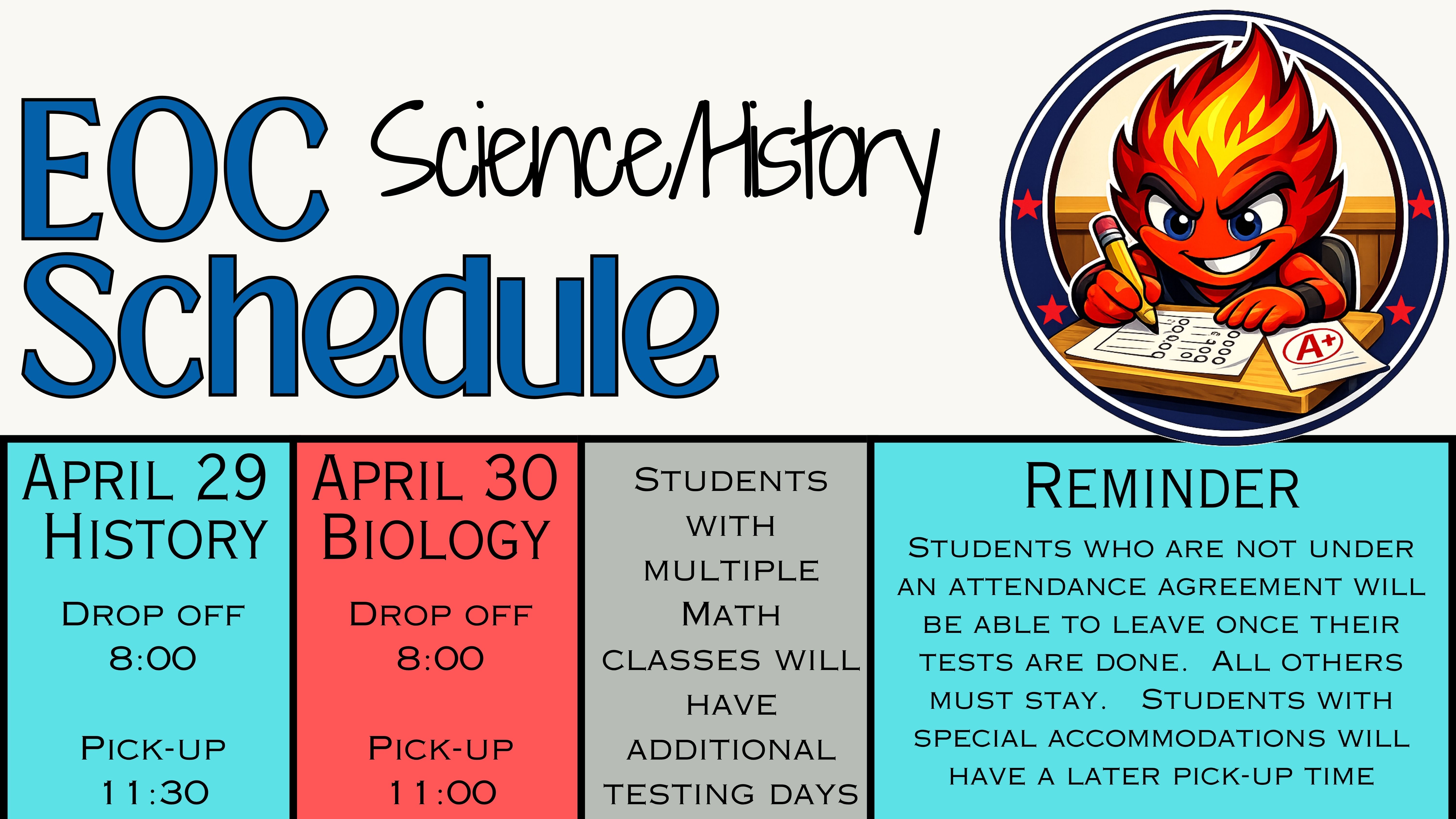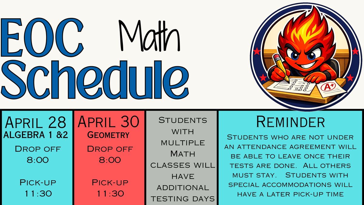 If you have a student who is taking multiple EOC's in the same subject, they will be notified of their additional testing day.